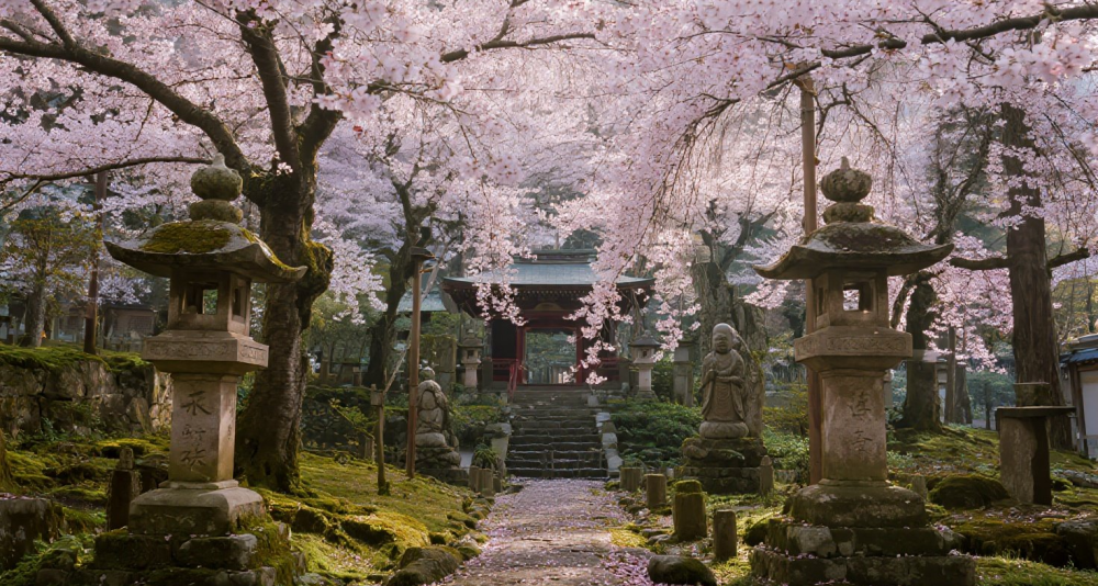 Located in Ōhara, northern Kyoto, Sanzen-in is one of the three imperial temples of Tendai Buddhism. Its vast grounds feature ancient trees, moss-covered paths, and murmuring streams. Seasonal landscapes include April cherry blossoms, May azaleas, July hydrangeas, and autumn foliage. The two chisen-style gardens designed by Kanamori Sōwa—Shuheki-en (Gathering Green Garden) and Yūsei-en (Garden of Clarity)—offer the finest views. The principal enshrined statue, a wooden Amida Nyorai, along with attendant statues, are designated National Important Cultural Properties.