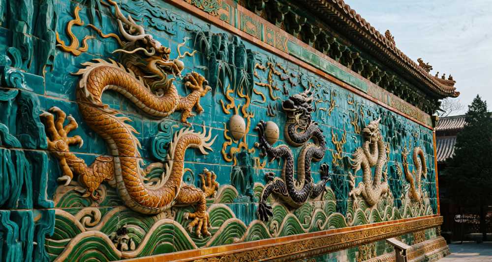 Nine-Dragon Screen : Datong, renowned as the "City of Dragon Screens," preserves nine dragon screens today. The most iconic is this 600-year-old Nine-Dragon Screen. Facing south, the screen measures 45.5m long × 8m high × 2.02m thick. Its massive body comprises 426 specially crafted seven-colored glazed hollow bricks – China’s largest and earliest dragon screen. Nine vividly colored dragons showcase imperial architectural mastery.
