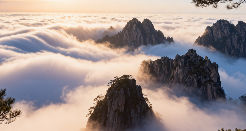 Its majestic landscapes and profound cultural heritage draw countless travelers. The "Four Wonders" - bizarre pines, grotesque rocks, sea of clouds, and hot springs - define its allure. Pristine mists churn through peaks: at times like raging ocean waves, at others like sheer veils, enveloping mountains in celestial grandeur. Every season unveils unique vistas awaiting discovery.